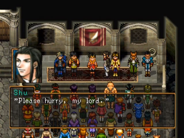 Early in the story, the protagonist and Jowy obtain the power of the Bright Shield and Black Sword Runes respectively, with each possessing great power that could turn the tide of the war. And indeed, as mentioned, the plot entirely revolves around the war. New characters are introduced into the narrative only according to how they affect the course of the war, and once the protagonist becomes Lord of a new nation himself, the war takes center stage even more extremely. Frankly, your best military strategist Shu, who is responsible for planning your every military success, is infinitely more vital to the plot than anyone else in the game. The protagonist by comparison is merely the guy who (in spite of being silent from our perspective) inspires everybody to fight their hardest.